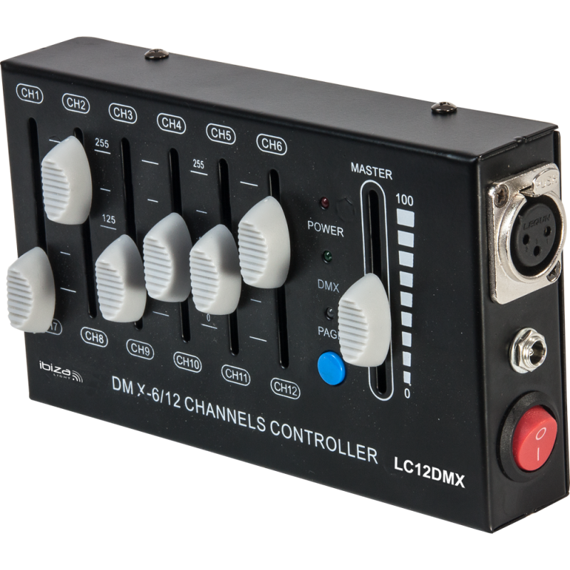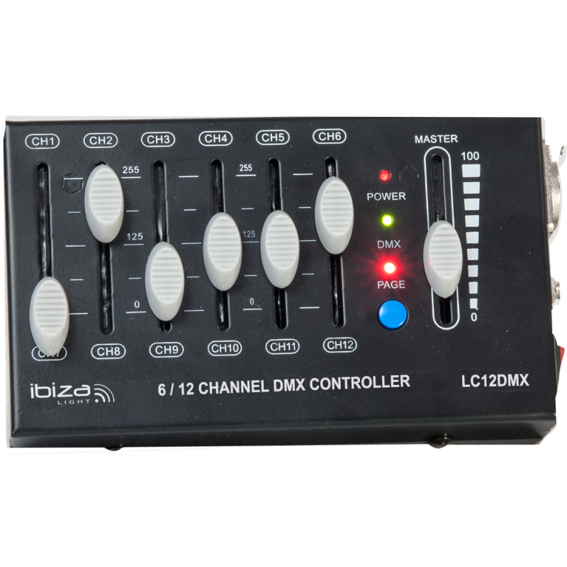 Compact-sized DMX controller for 12 DMX channels divided in 2 pages of 6 channels each.Output via 3-pin XLR connector.