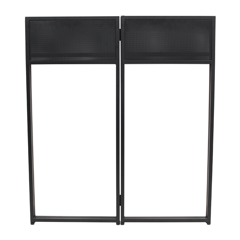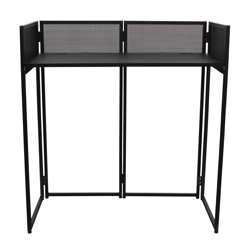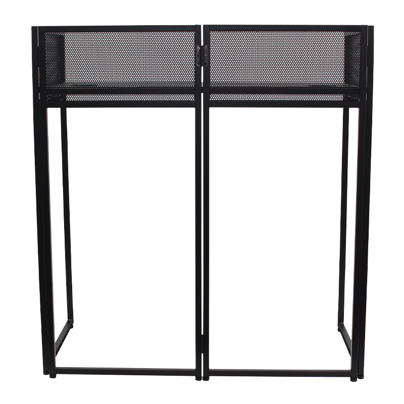 A compact and portable foldable DJ stand supplied with steel shelf, both black and white lycra panels and a carry bag. The Equinox Combi booth offers a fresh approach to DJ booths where the mesh upper facade provides some privacy to hide cables and connections without totally blocking the DJ from view.