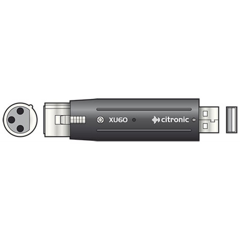 USB-powered interface converting an XLR female audio signal into digital audio via a USB A connection, for PC/Mac recording.