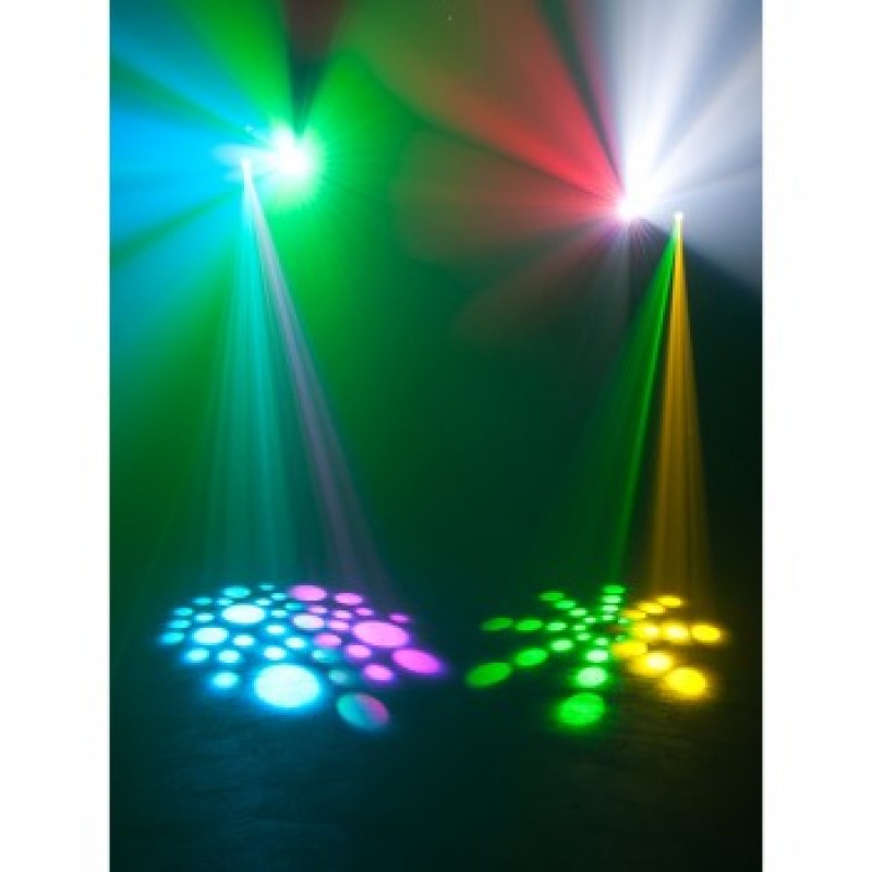 - High output dual mini Moving Heads, each with a bright white 12W LED source