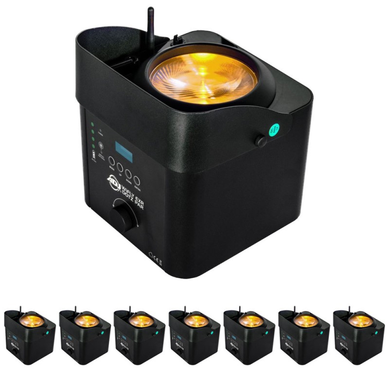 - Rechargeable Lithium battery powered, with wireless DMX- Extended range wireless DMX: Up to 2,500 feet (760M) when used with ADJ’s WiFLY EXR Battery Transceiver