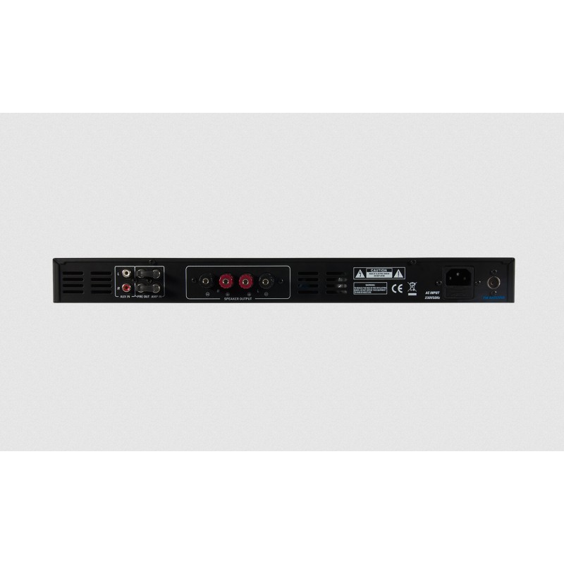 Powermate is the new Newhank all in one compact stereo background music source solution with integrated 2x 100 watt RMS amplifier.Only 1 rack-unit high, Powermate plays WAV or MP3 files from a USB thumb drive/ SD card or it can stream the audio from any smart media Device via Bluetooth..On board is an FM radio and connections for a Microphone and Aux input Device (like a CD Player).On the rear apart from the aux input,we have provided for a separate main-amplifier input and pre-amplifier output connection.This makes it fairly simple to connect a soundproof limiter or to expand the setup by adding a subwoofer etc.The internal amplifier is able to drive up to 4 small 8 Ohm loudspeakers, powerful enough as a background music system for a restaurant, coffee shop, office and so on..