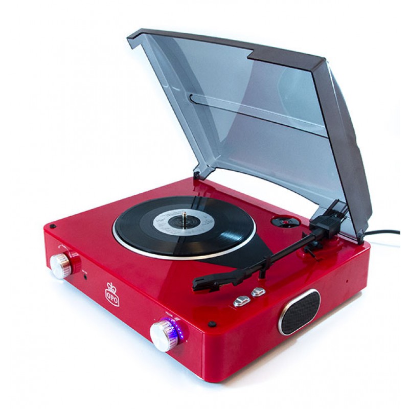 The turntable has a shiny piano finish and is available in red and black. This record player is compatible with all record variants: 33, 45, 78rpm.