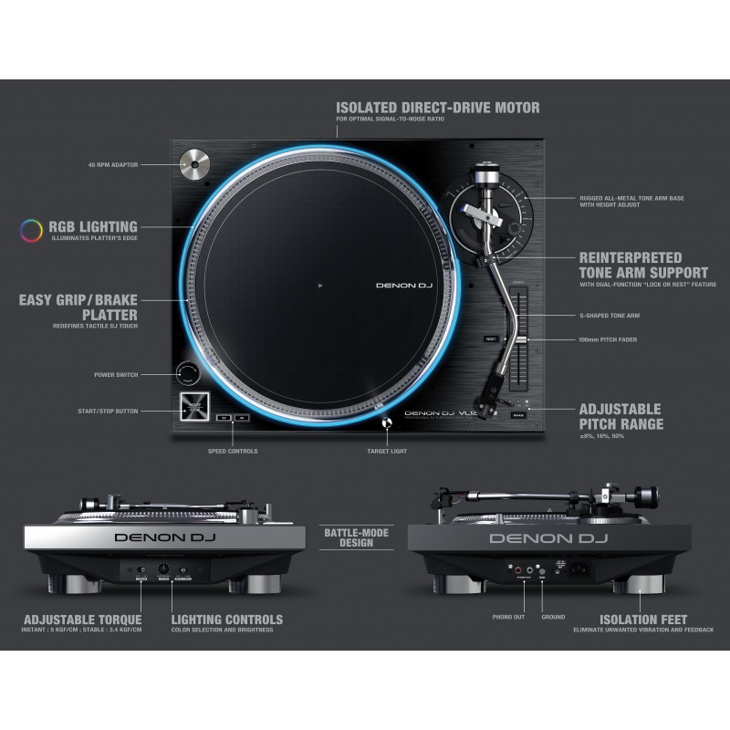 The Denon DJ VL12 Prime sets the new bar position as the most superior turntablist technology available today. Featuring the most optimal acoustic isolation capabilities, able to handle any loud, bass-heavy environment, there’s no classic or control vinyl-based gig the VL12 cannot handle. This true quartz locked, direct-drive Pro DJ Turntable offers you the most exhilarating ‘hands-on’ performance experience you could ever imagine.