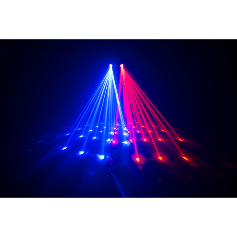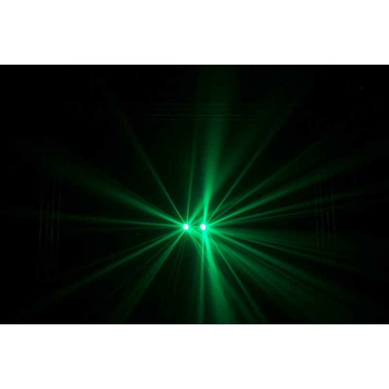 Swarm 4 FX combines three dynamic lighting effects in one rugged and compact housing. A single fixture includes quad-color (RGBA) dual moonflowers, a green laser and a white strobe. The dual moonflowers spin enough colorful beams to fill an entire dance floor with energy and excitement. Added impact is provided by the thousands of razor sharp green beams produced by the laser. The bright output of the strobe ring, which features built-in motion effects, adds to the fun. Control options include sound activation, master/slave, DMX modes or the IRC-6 remote.