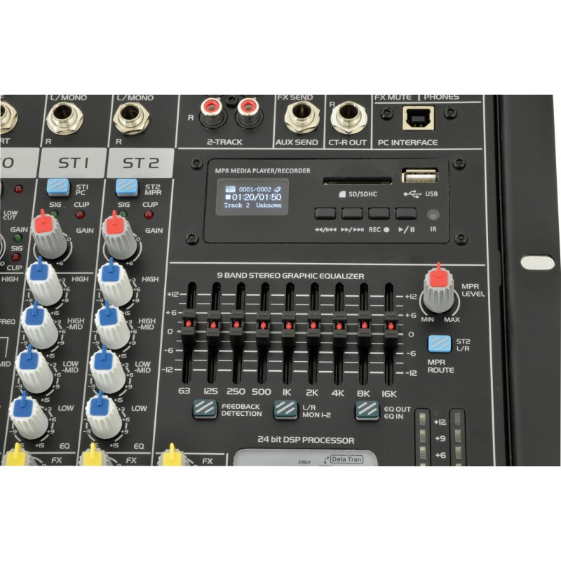Studio grade mixing console with 10 fully featured mic/line channels and 2 stereo line channels, which can be switched to serve internal and external USB audio sources. Digital audio files on a USB pen drive or SD card can be played back or recorded via the on-board MPR unit and a USB B socket enables peripheral connection to a PC or Mac computer. Comprehensive routing and high quality audio for all studio and live duties.Features