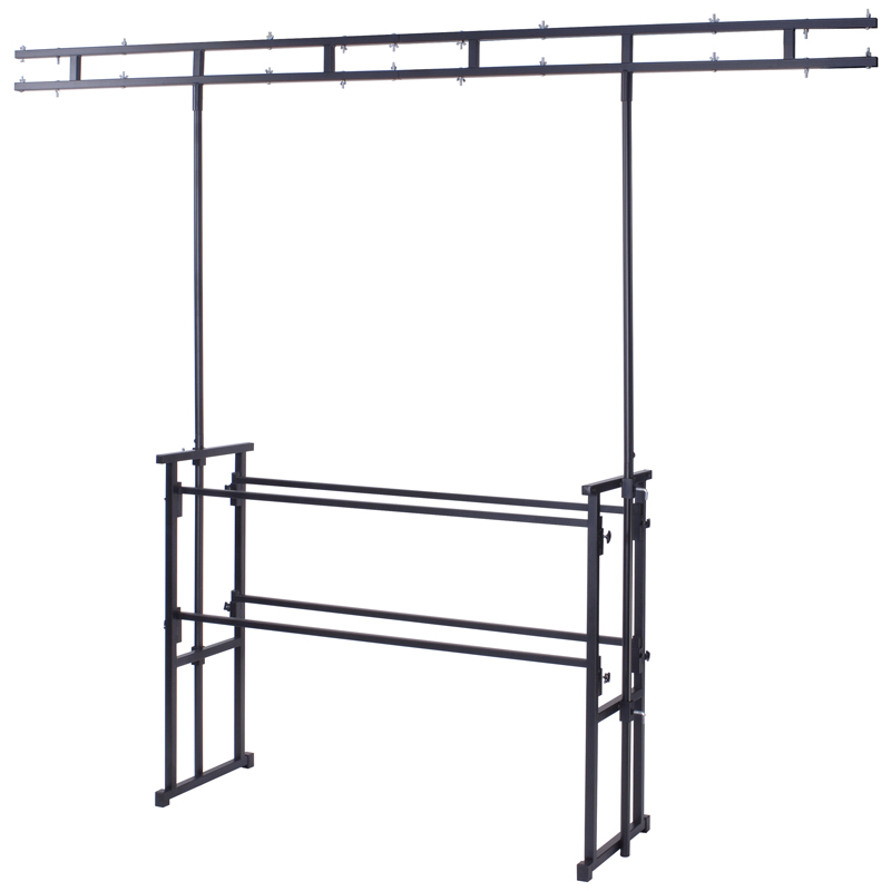The ideal solution for setting up your mobile disco rig. This stand allows you to place flight cases, laptops, controllers and mixers on top with an additional shelf underneath for amps and lighting controllers. A height adjustable, heavy duty twin lighting bar is pre-drilled for mounting effects.