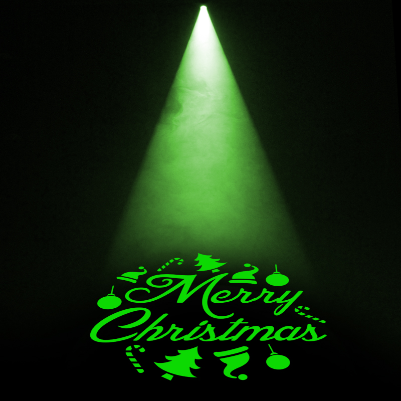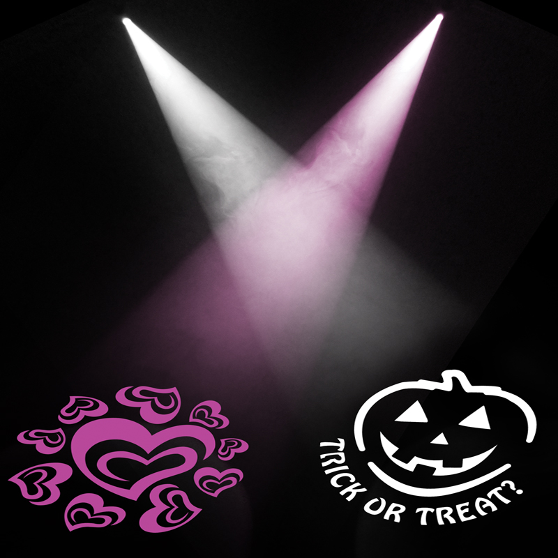 The Gobo Projector allows you to project a custom message or image. Powered by a 30W LED, this high-output gobo projector comes with 11 easily replaceable, rotating gobos. Custom gobos can be created at home from transparency material and an ink printer. The manual focus adjustment allows the user to create crisp imagery.