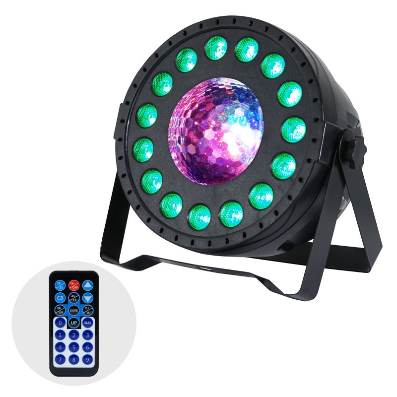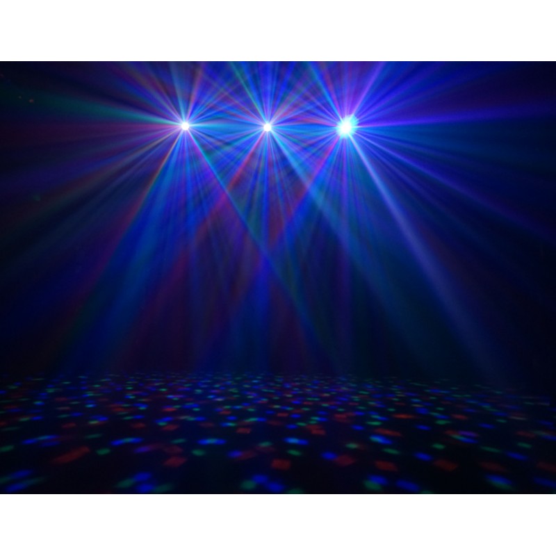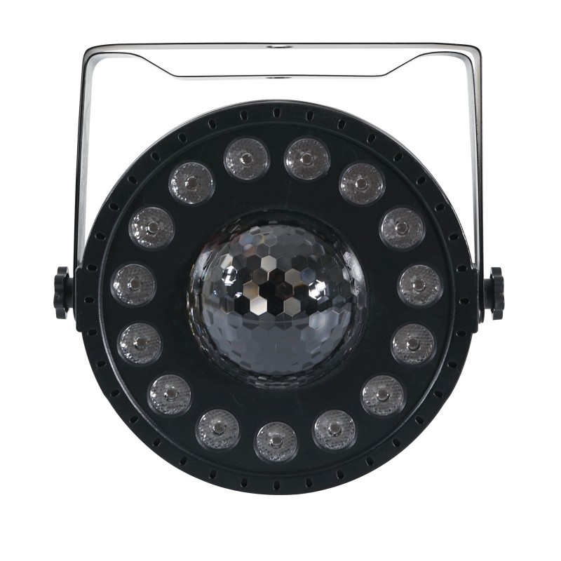 The MoonPar projects a wide array of multicoloured beams of light that rotate and twist around the room. 15 tri-colour LEDs sit in circle around the front of the unit adding a coloured wash effect for an extra dimension. Control is facilitated via the 4 push button menu on the rear, to select between DMX, auto or sound modes plus the built-in programs.