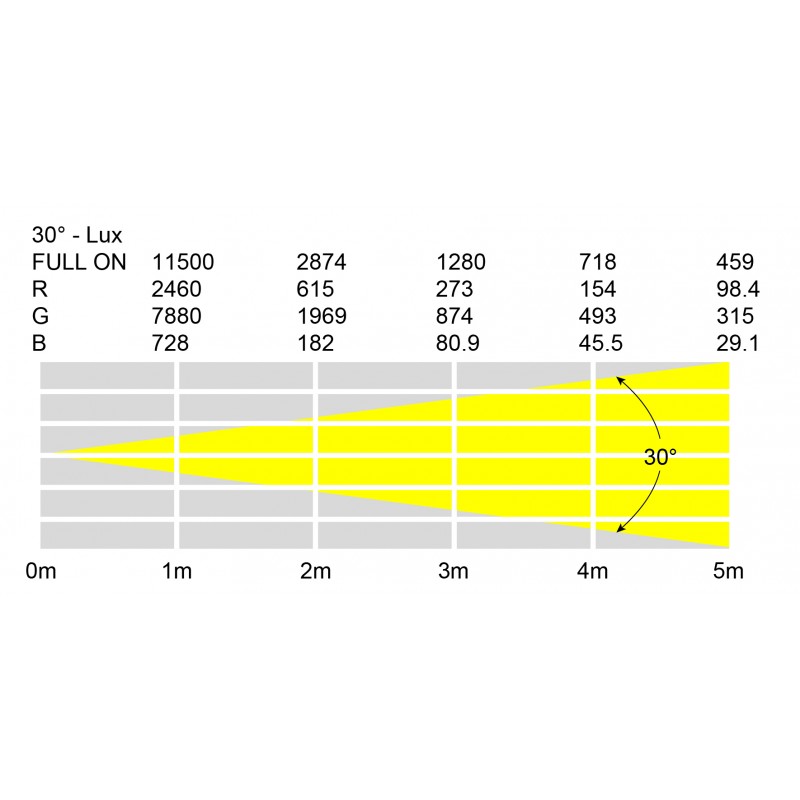 - 288 x 10mm LEDs (R: 108, G: 96, B: 84)- Beam angle: 30°- 2,874 Lux @ 2m (full on)