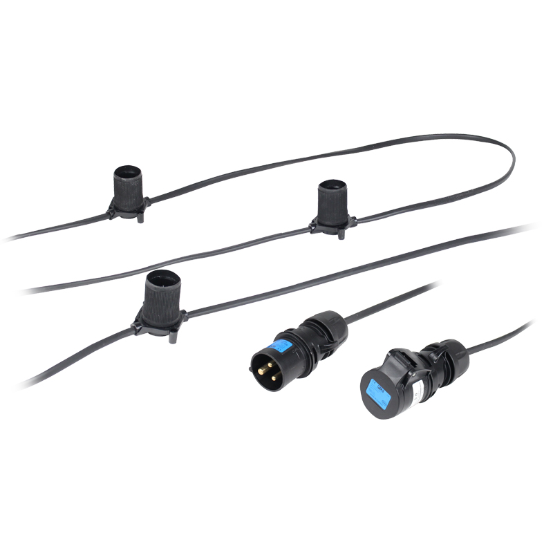 Manufactured in the UK using flat twin 2.5mm² Arctic grade PVC with a black outer sheath, each festoon harness is fitted with ultrasonically welded lamp holders and finished with a PCE Midnight black 16A plug and socket ready for use. Festoon lighting is perfect for lighting up pathways, trees, marquees and pergolas, and is a stunning addition to weddings, festivals, garden parties and other outdoor events.