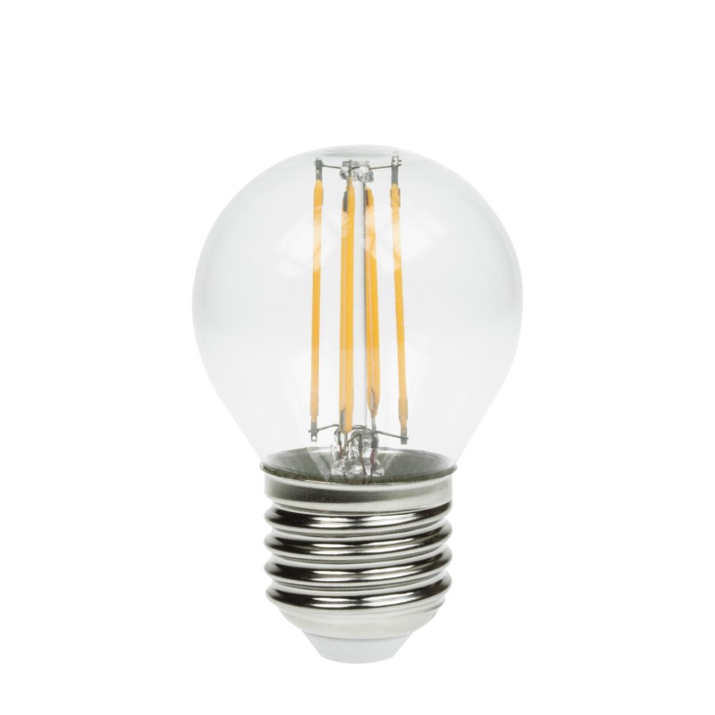 This 4W golf ball LED filament lamp is a perfect replacement for domestic, hotel, restaurants and various other decorative applications. The innovative design of the exposed LED Filaments replicates the appearance of an incandescent filament bulb offering 360 degree light distribution as well as all the other benefits of LED technology. At 400 lumens this 4W LED filament golf ball lamp is an ideal replacement to the traditional 40W standard incandescent golf ball bulbs.Features