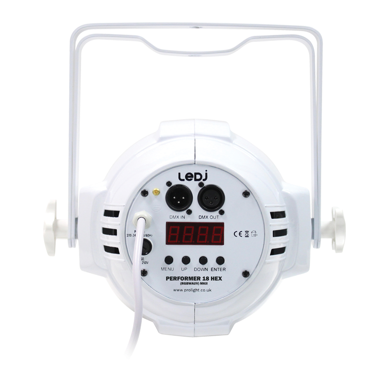 The Alu Performer Par HEX has 18 x 12W six-colour LEDs punching out astonishing levels of colour ideal for uplighting in large venues, general stage wash and illumination. This fixture offers superior performance in a robust, yet lightweight cast aluminium housing, and features a simple to operate 4 push button menu that allows users to select several operation modes.