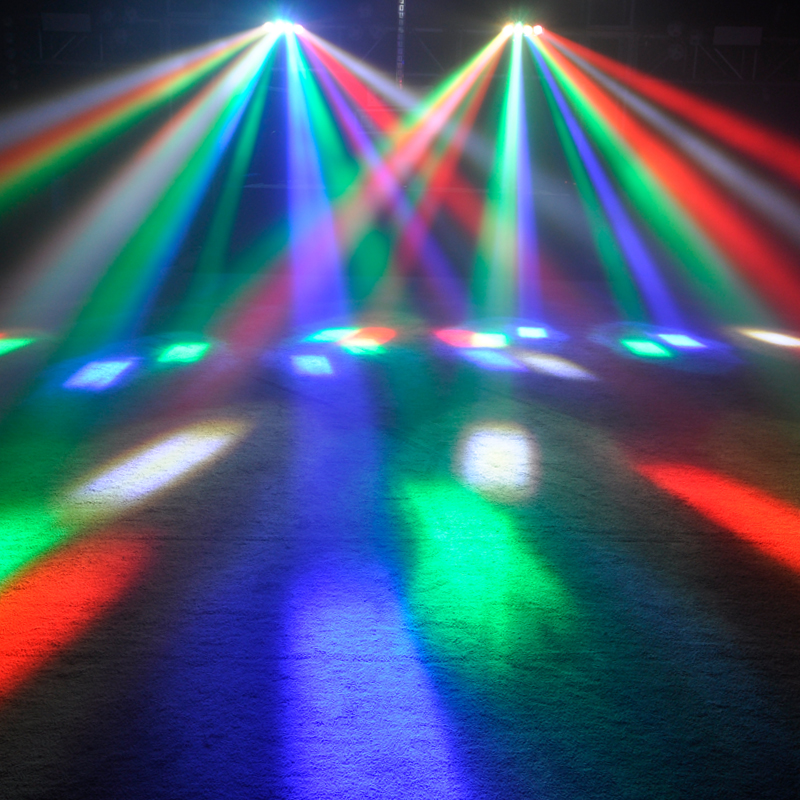 The Dragonfly Quad is a dynamic multi-beam effect featuring two sweeping LED bars, each loaded with four individually controllable LEDs. The eight vibrant coloured narrow beams project across the room making the fixture ideal for a multitude of environments from stages and clubs to mobile DJs. This agile fixture creates amazing lighting shows when used in multiples but also makes an outstanding centrepiece.