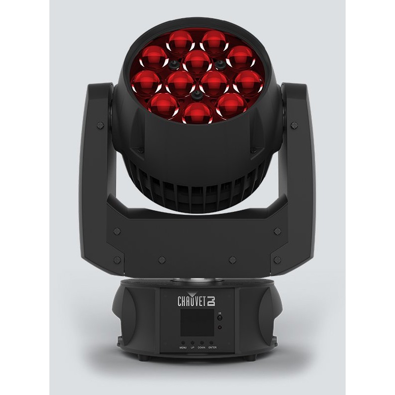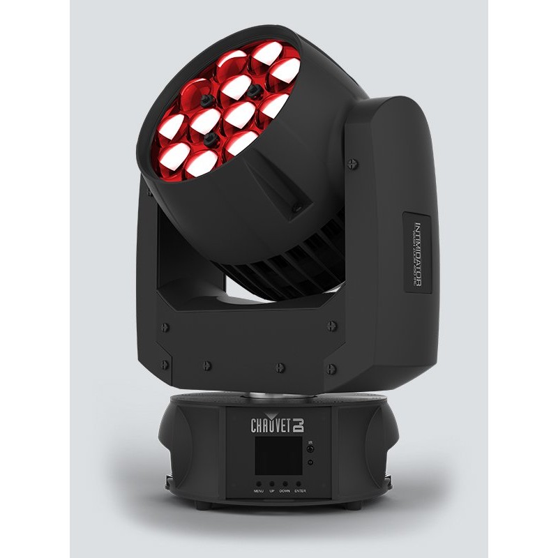 Intimidator Wash Zoom 450 IRC is a powerful moving head wash fitted with twelve 15 W quad-color RGBW LEDs and a motorized zoom for short-throw or longthrow applications. Other convenient features include a Totem mode that keeps beams aimed at the dance floor and eye-catching auto programs with zone control. Wireless (non-DMX control is possible using the optional IRC-6 remote. Up to four fixtures can be linked to create synchronized shows in automated, sound and master/slave modes.