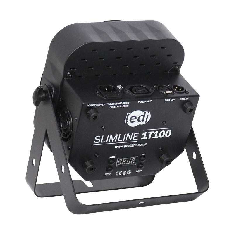 Housing a 100W tri-colour RGB COB LED, the Slimline 1T100 gives smooth colour mixing from rich saturated hues to subtle pastel shades. These units have a rugged, all metal housing, side entry XLR and power connections and measure only 130mm in depth for easy transportation and installation.