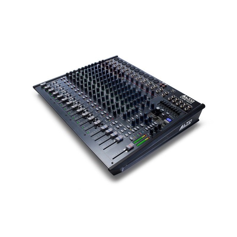 The Alto Professional Live 1604 is a pro 16-channel, 4-bus mixer equipped with the tools you need to create the perfect mix. With flexible routing options and a multitude of onboard DSP tools, Live 1604 fits the demands of nearly any live performance environment. It features 10 balanced XLR inputs with switchable phantom power, 3-band EQs with sweepable mids for additional tonal shaping, four aux sends per-channel for external effects and monitoring, and a 9-band graphic EQ for main or monitor outputs. A headphone jack with an independent level control enables additional monitoring and mixing. 60mm faders with LED meters provide precise control and visual feedback for accurate, hands-on mixing. With its diverse connectivity options, Live 1604 can handle any sized event from small coffee house gigs to mid-sized ensembles to full-stage rock bands.