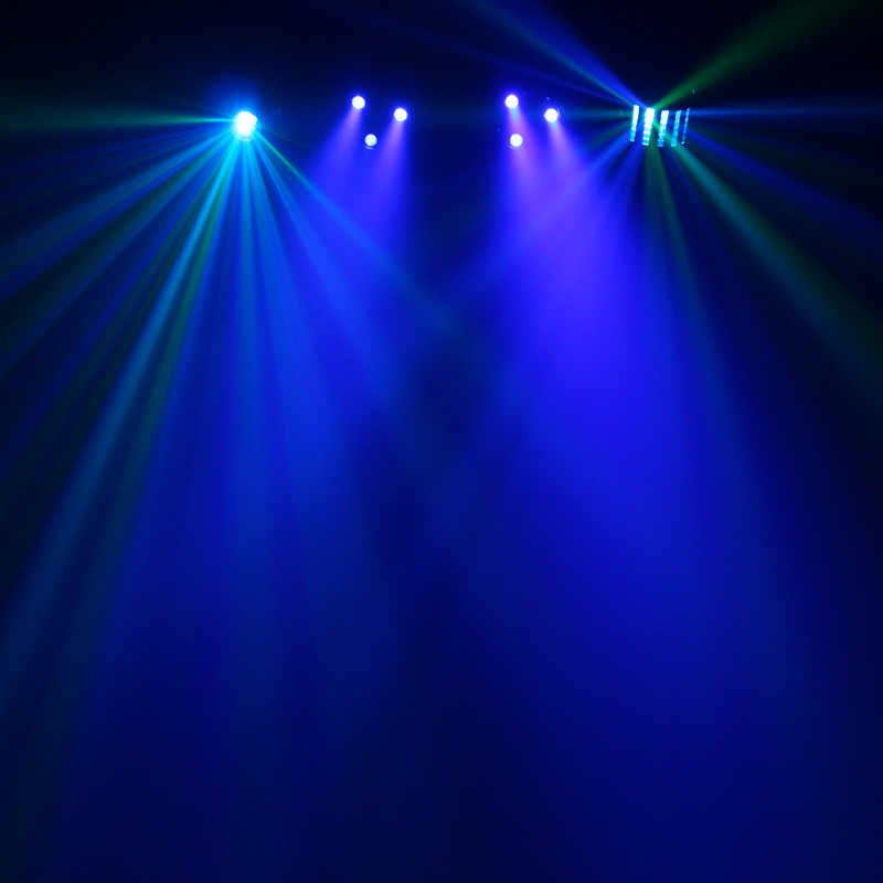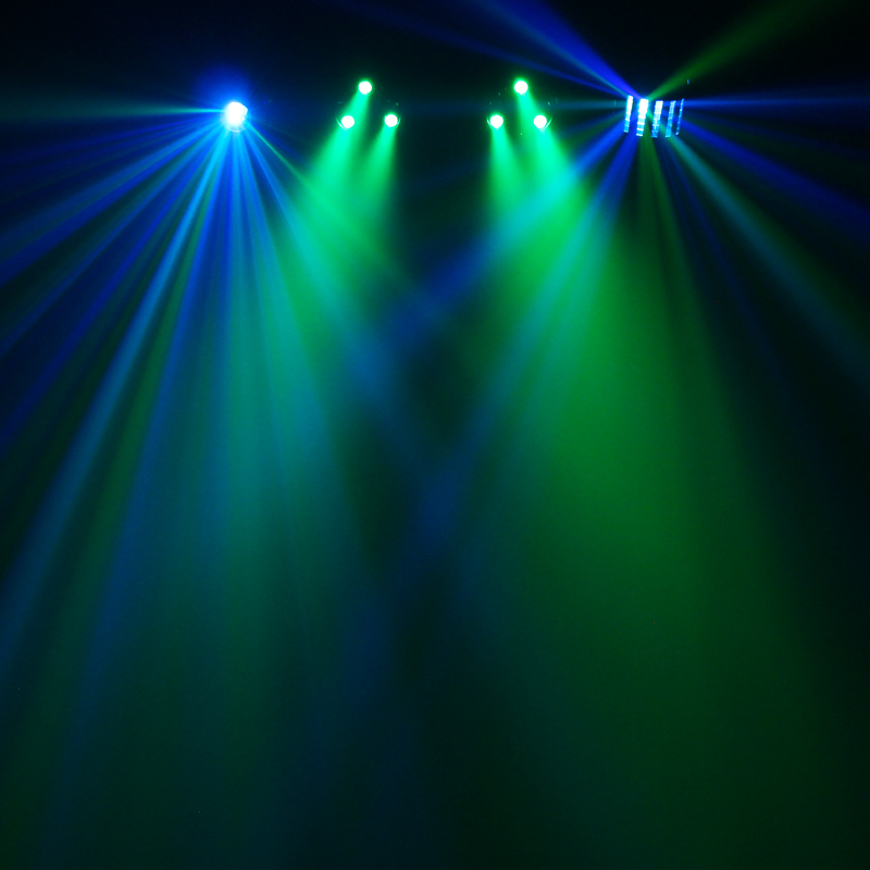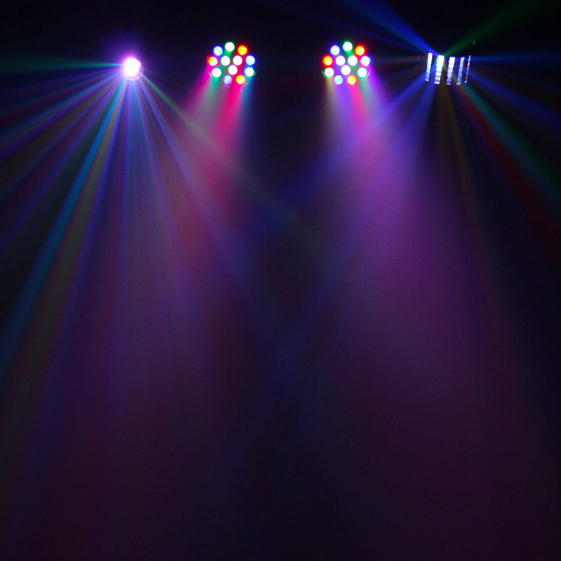 - 2 pars each containing 12 x 1W LEDs (R: 3, G: 3, B: 3, W: 3) plus 2 effects each containing 1 x 10W quad-colour LED (RGBW)- Beam angle: 25° (pars)