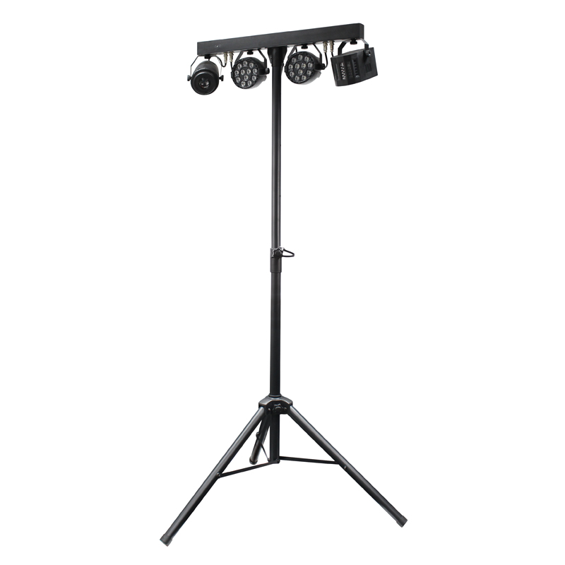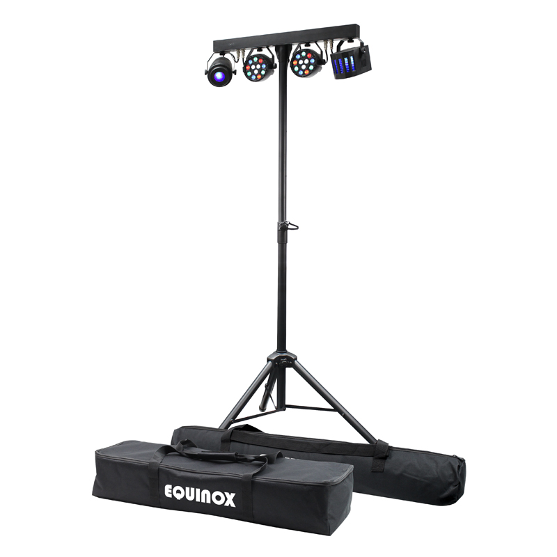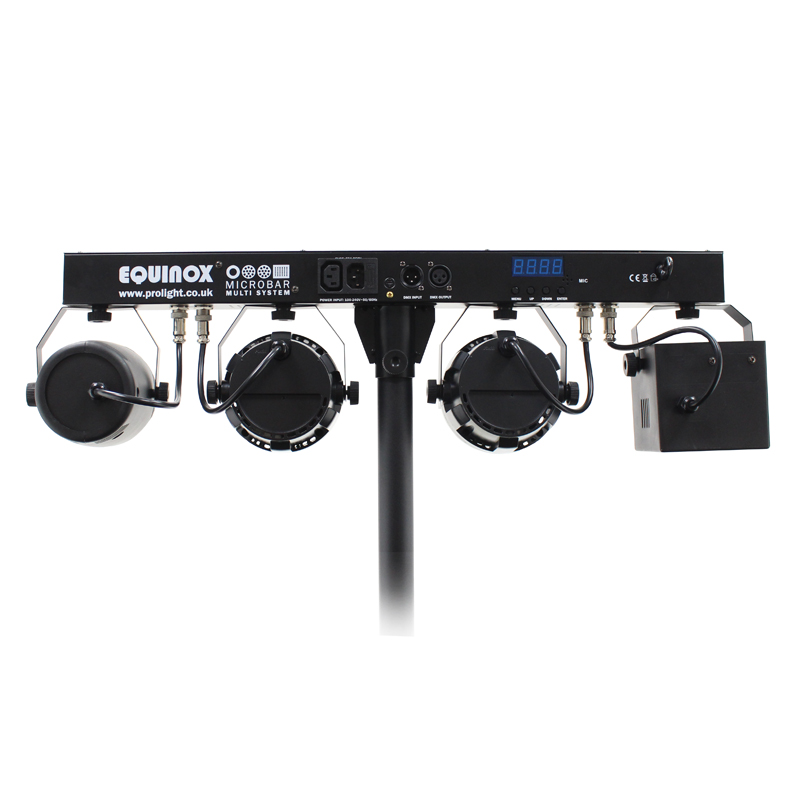 A compact, all-in-one lighting package, the Equinox Microbar Multi System includes a robust, heavy duty stand, heavy duty road bag, IR remote, 2 multi-colour LED Par panels and 2 light effects fitted to a powered T-bar. The 4 LED units are of a micro size and lightweight design. The user has control over colour, auto, sound active and DMX modes, via the LED display and push buttons. The IR remote gives instant and simple control over several control modes: blackout, auto, sound and colour.Features
