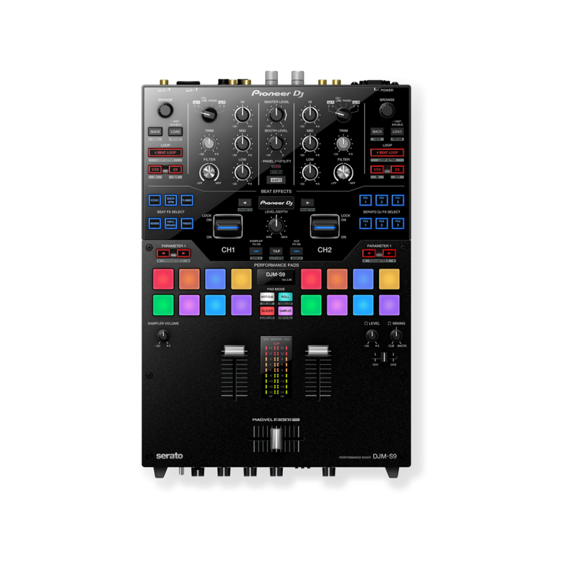 Meet the DJM-S9, our first two-channel battle mixer for Serato DJ. The fully customisable Magvel Pro crossfader, tactile performance pads and FX buttons let you tailor the mixer according to your preferences. So get ready to decimate the dance floor with personalized FX and rigorous scratch performances.