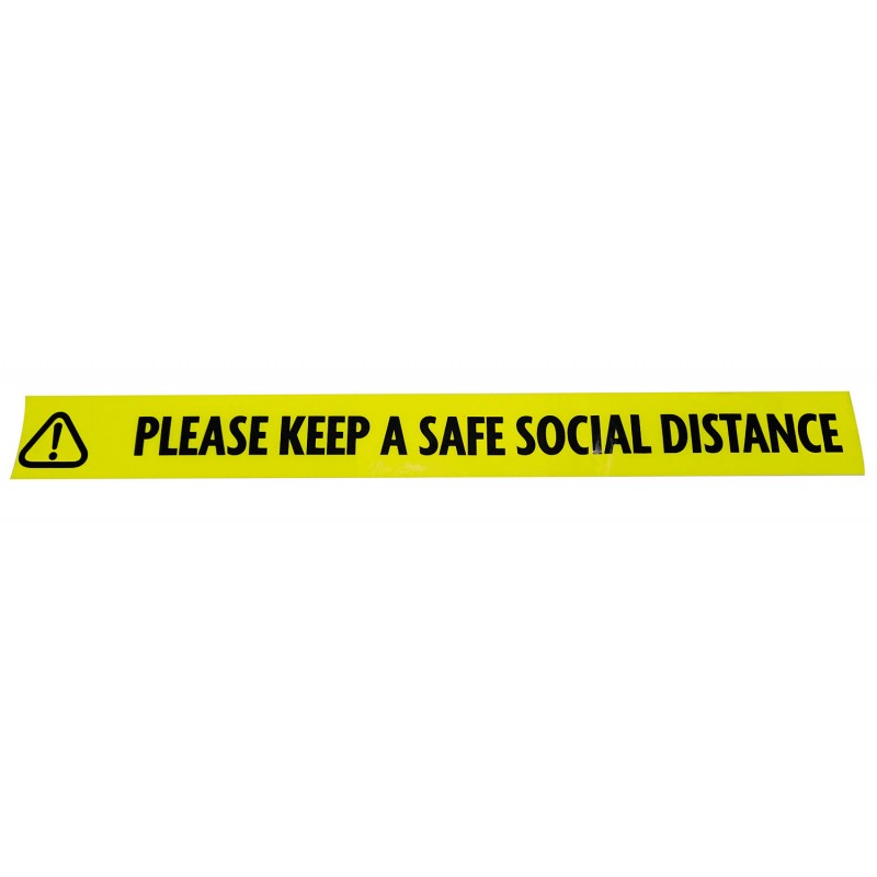 Bright yellow PVC laminated floor marking tape with the words - 'Please Keep A Safe Social Distance'. Ideal for marking out safe distancing spaces within places where social distancing needs to take place to keep people safe.PVC durable coating