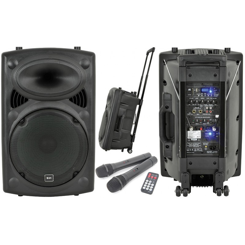 Self-contained portable PA units based on the QR-series speaker cabinet. Built-in amplifier operating from mains or internal rechargeable battery powering a main driver and compression driven horn unit. A pair of VHF handheld wireless microphones are included with the receiver built into the mixer/amp section at the rear along with 2 further mic inputs, auxiliary line input and integral USB/SD media player. A moulded handle and pole mount are included and a retractable trolley handle and rear wheels provide easy portability.