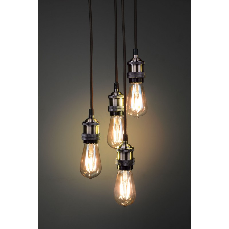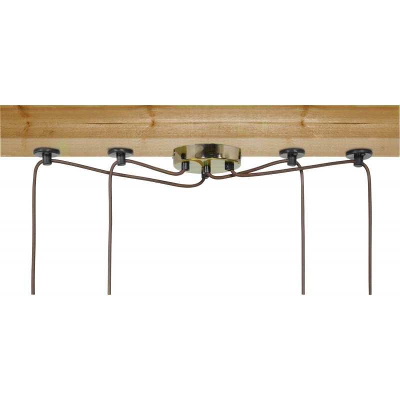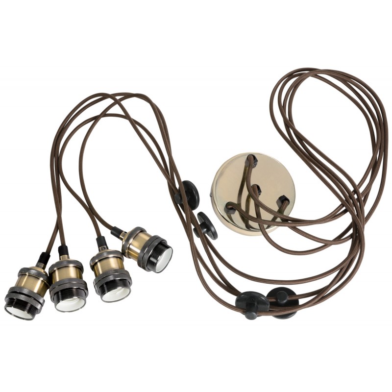 Decorative quad cord sets comprising 4 x E27 lamp holders, each with 1.8m nylon braided mains cable, wired to a single plated steel ceiling rose. 4 mains cables each have a rubber pad for fixing to a ceiling or beam to allow spacing of drop points for each pendant. When fitted with vintage styled filament lamps, these cord sets can form part of an aesthetically pleasing retro lighting scheme.