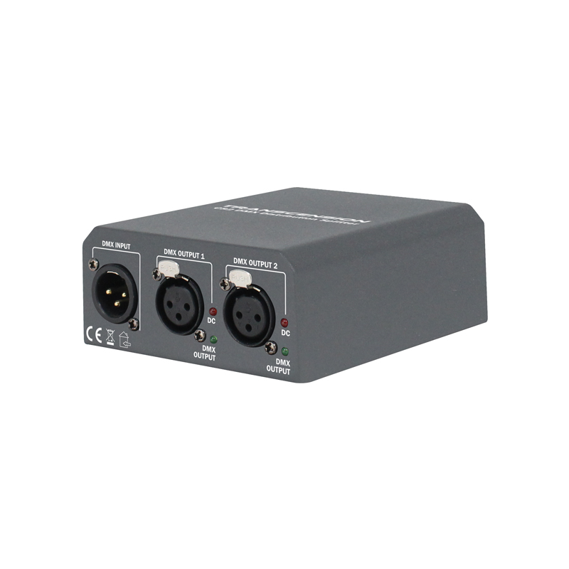 A combination 2 way DMX booster/distributor featuring one input and two outputs plus IEC power input and IEC power output. Both DMX input and DMX outputs are provided with 3-Pin XLR connectors, each DMX output has an independent driver.
