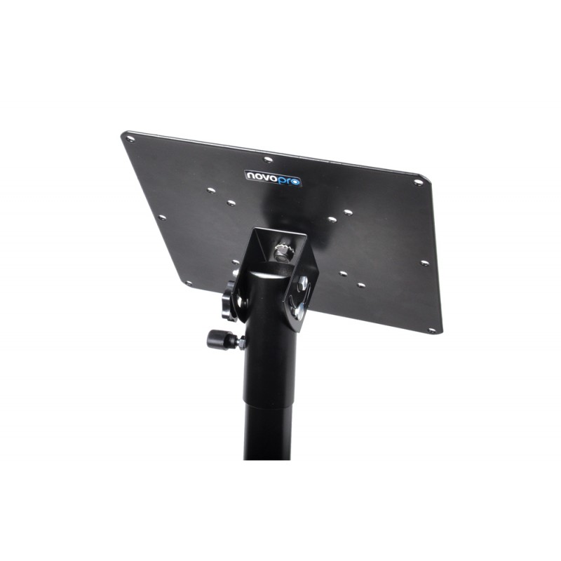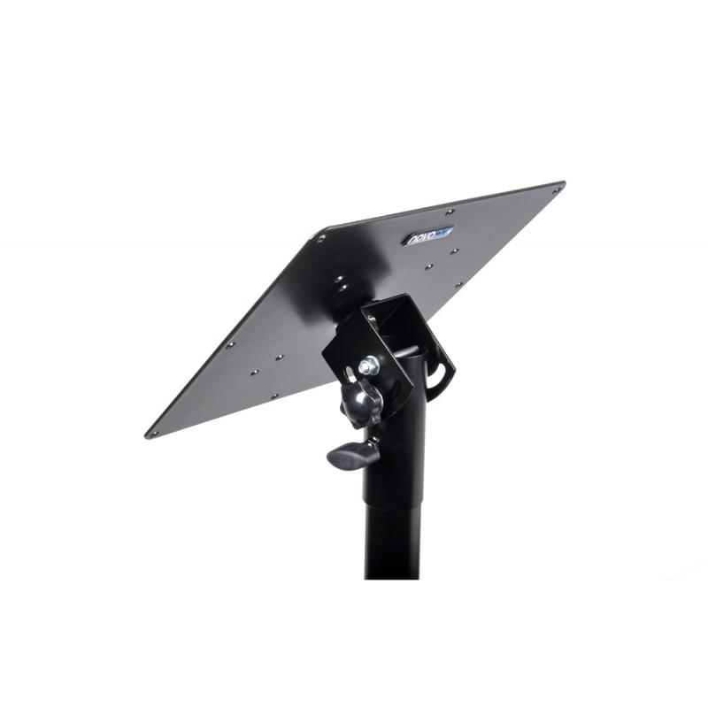 The unit can be used with a speaker stand, lighting stand or any type of pole that has a 35mm open end. The mounting plate is fully adjustable in angle and rotation and is locked in place with thumbscrews.